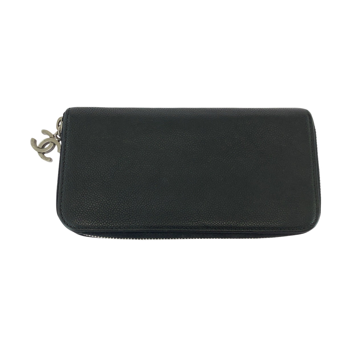 CHANEL Long Wallet Purse Caviar skin Black SilverMetal Long Wallet Purse Zip Around COCO Mark Women Used Authentic