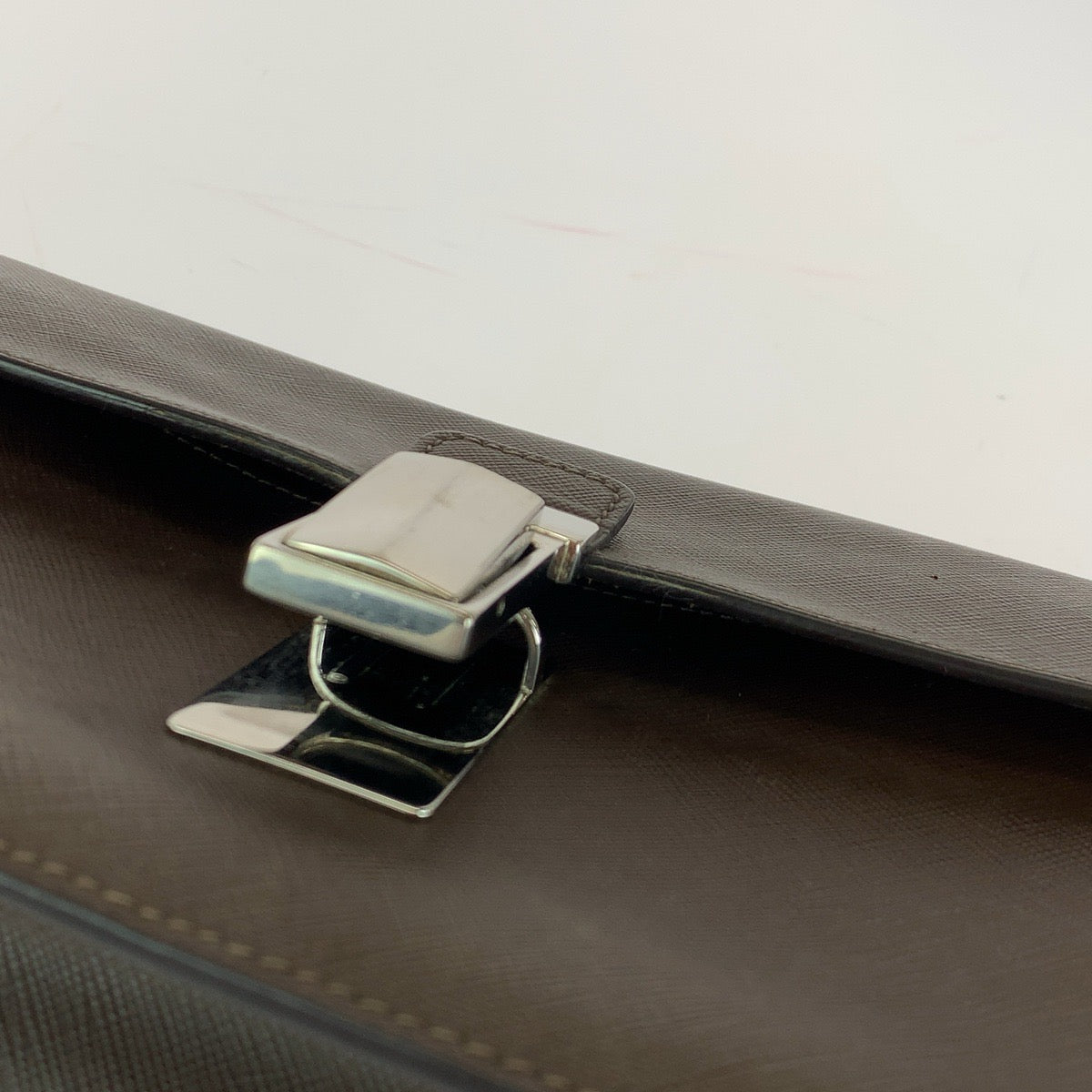 PRADA Clutch bag leather Brown Silver Metal Clutch bag business bag Safiano Triangle With logo mens Used Authentic