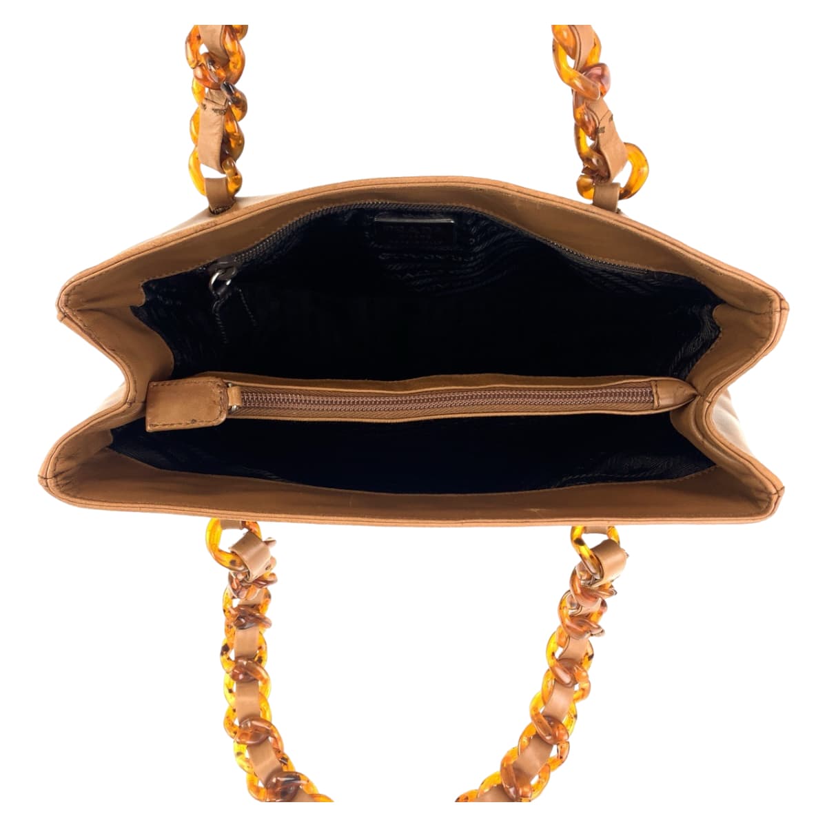 PRADA Tote Bag Leather, Plastic Brown Silver Metal Tote Bag Shoulder Bag Marble Plastic Chain Women Used Authentic