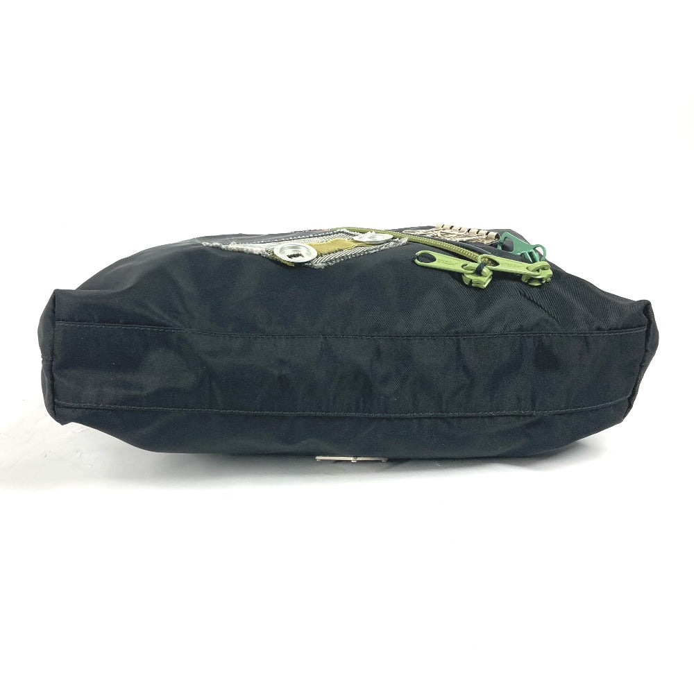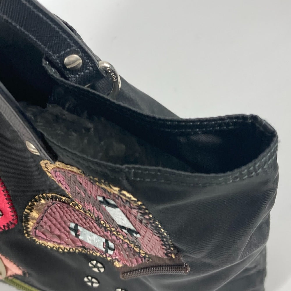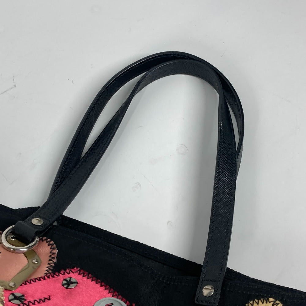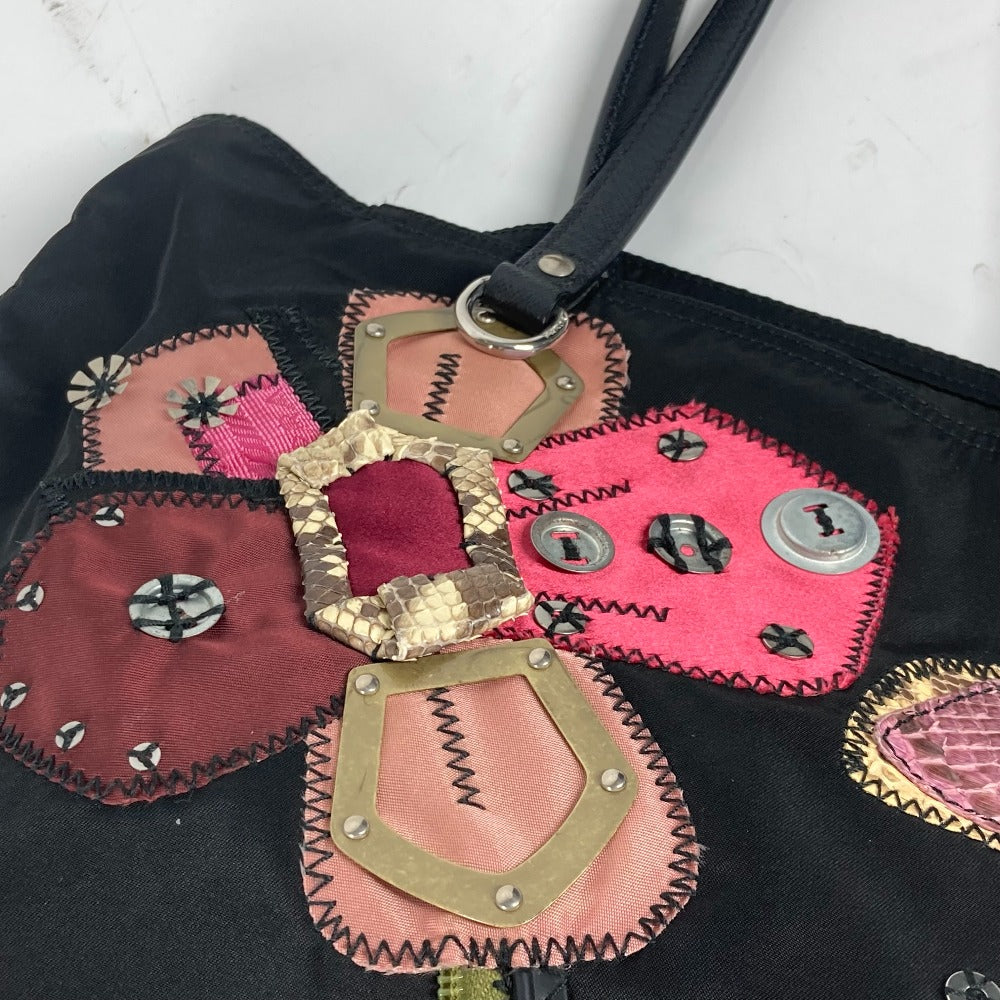 PRADA Tote Bag Nylon, Leather black Embroidery Flower Metal Flower