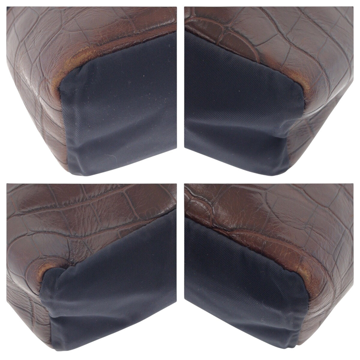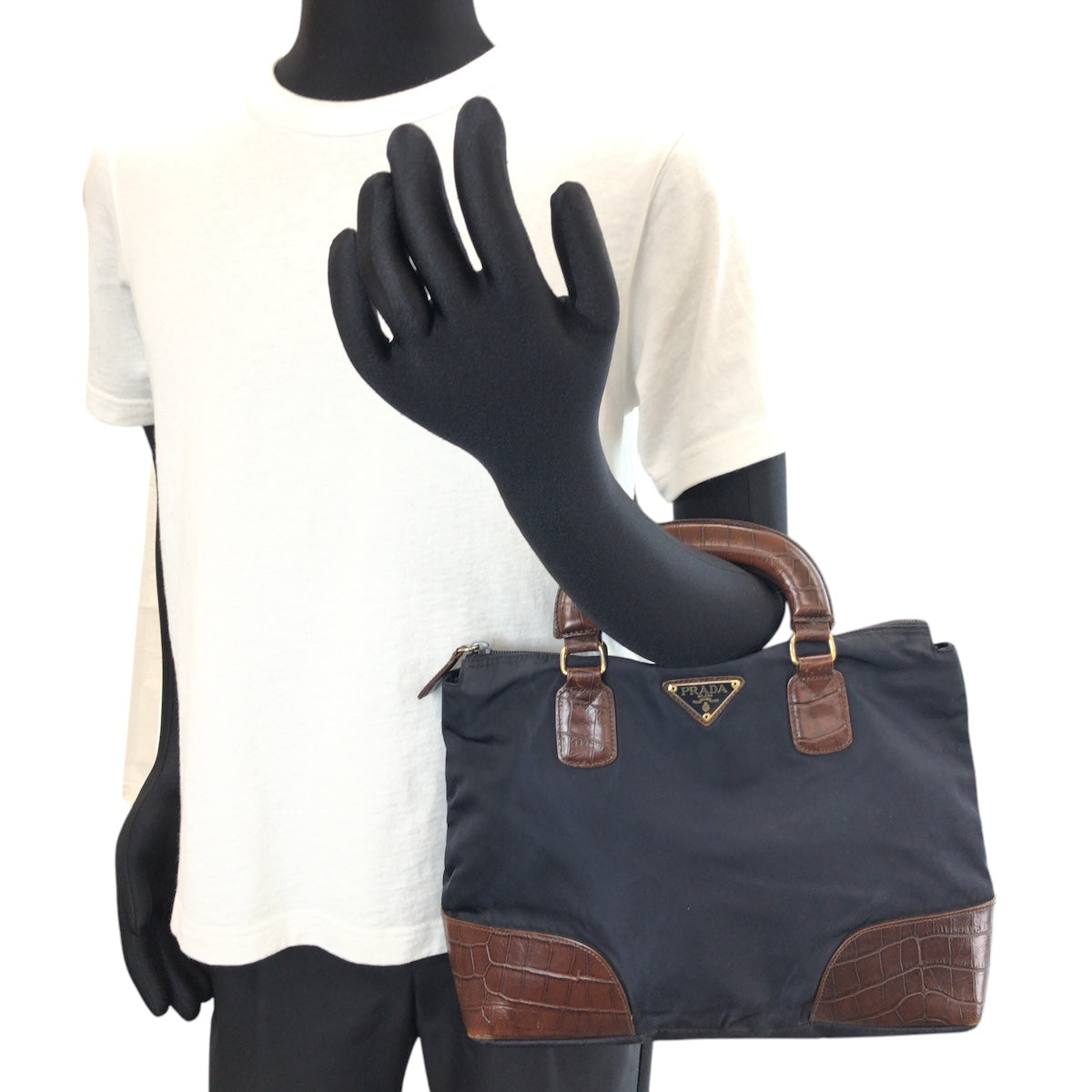 PRADA Tote Bag Nylon, Leather Navy Brown Gold Metal Tote Bag handbag Tessuto embossed Triangle With logo Women Used Authentic